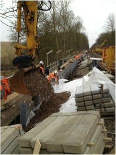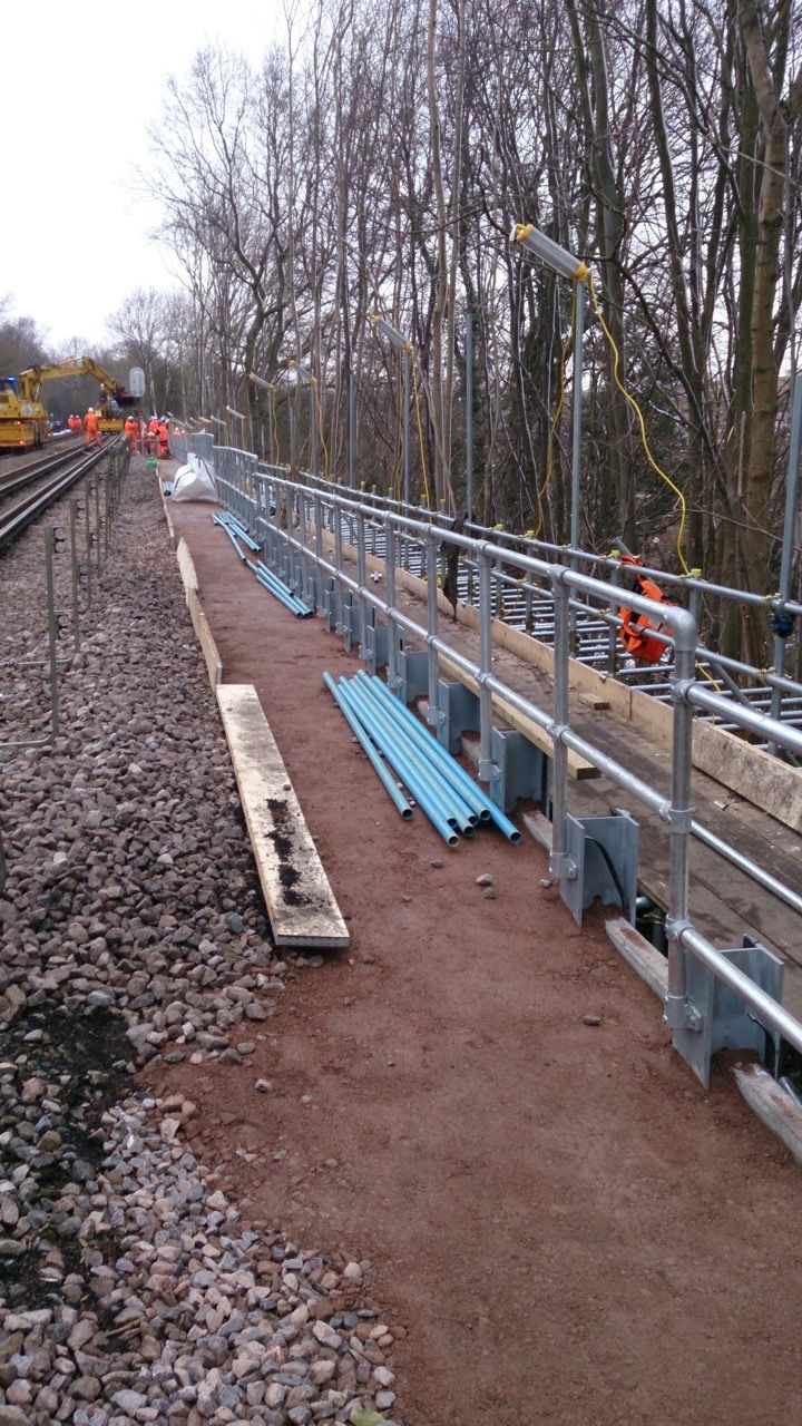 The area behind the post and plank wall was built up to form a gravel walkway and Kee-clamp handrail along the entire structure. Possession weekends involved the use of six RRV’s for driving the kingpost piles and 450 were installed over 2 weekends within full blockades. Works before the scheduled possession weekends involved the installation of two scaffold working platforms to both extremely steep embankments, these would enable level access to the line of driven piles and minimise the risk to plant and personal.