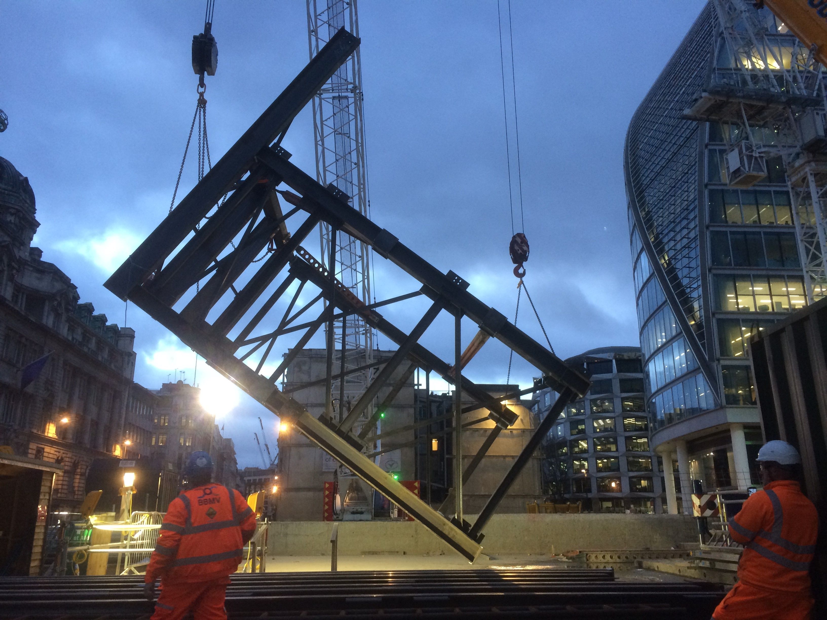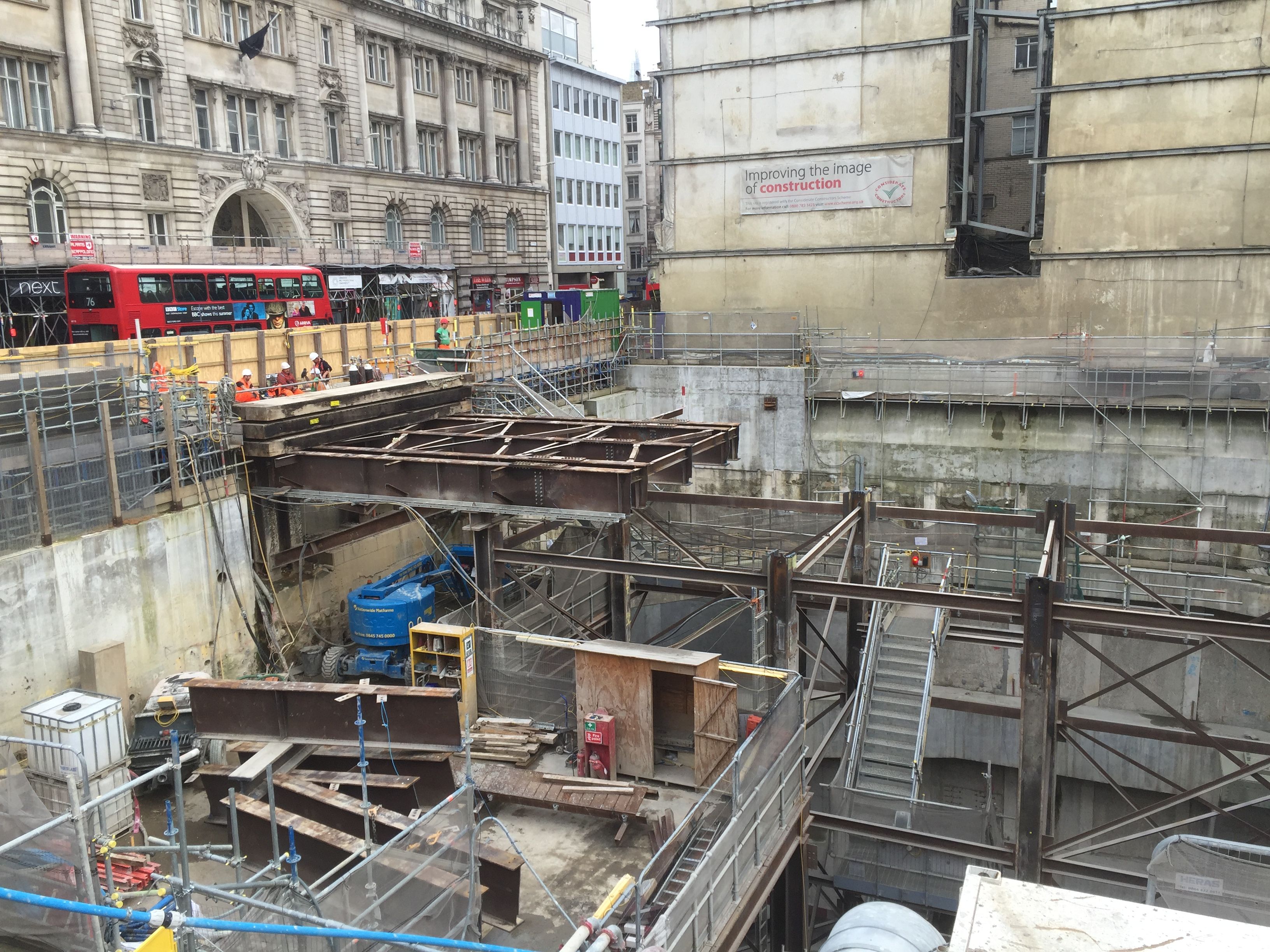 A 30m deep access shaft had been excavated by a previous Crossrail contractor to enable various tunnels to be excavated between Liverpool Street, Moorgate and two new East/West Crossrail running tunnels. The top down construction resulted in a large jetty structure in the middle of the shaft that would require dismantling and removal at a later date, but a series of heavy duty platforms would be required in order to stage the tunneling works.