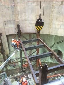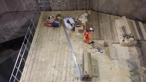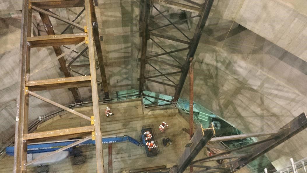 Spoor-Tech took an early lead in the design and practical advice on construction within a small assembly area and already congested shaft. We identified at the outline stage that the platforms could be designed as a modular system and we could assemble sections at street level to be dropped into place and bolted to the main structure, this worked to good effect and although the sections when assembled in the area at street level, weight in excess of 14t, there was a huge advantage to freeing up crane time from holding individual members in place for bolting at the work face.
