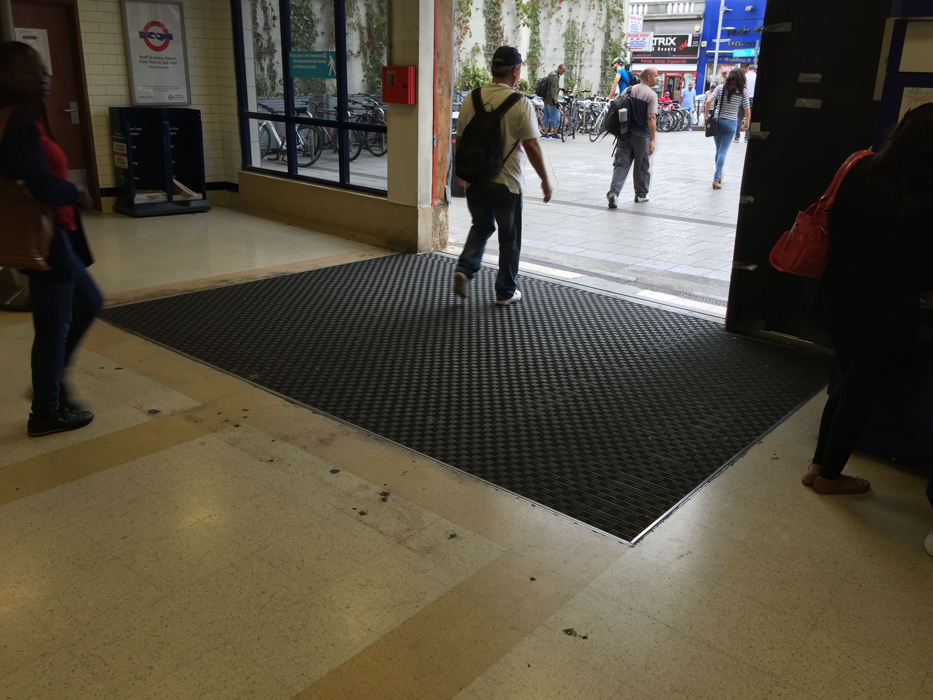 The works involved the removal of the existing temporary entrance and the design manufacture and installation of a new entrance facade from expanded metal cladding to the station. As well as the cladding, a new drained matwell and Bostwick Gate where both installed to update the entrance and Deliver a new look station entrance. Works were undertaken during Engineering Hours but we made good use of Traffic hours behind a temporary hoarding for low level cladding works and Framing.
